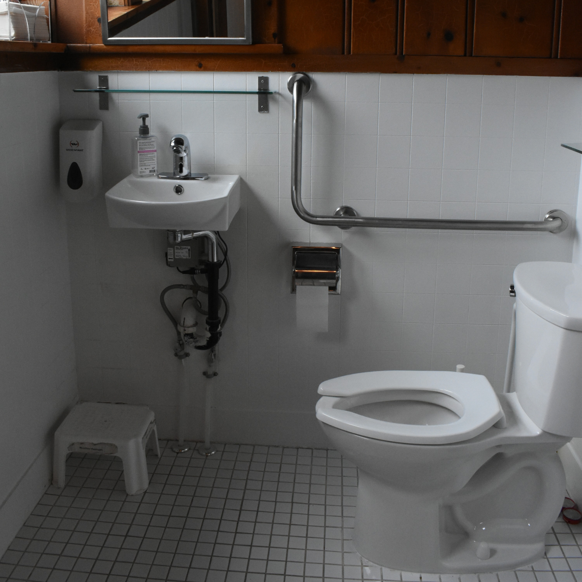 Mackin House Museum has one bathroom located on the lower floor on the left hand side of the main entrance. The bathroom is gender neutral, with a grab bar located next to the toilet. There is a stool in the corner of the restroom that guests can use at their convenience. There are no loud hand dryers inside the restroom.
