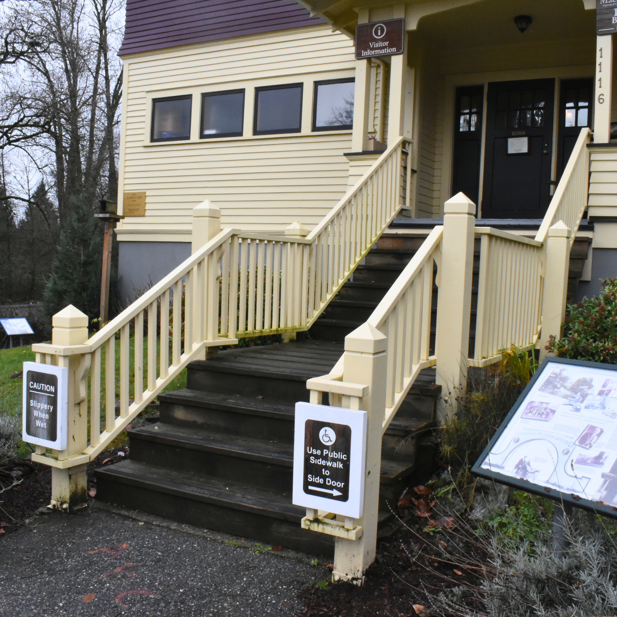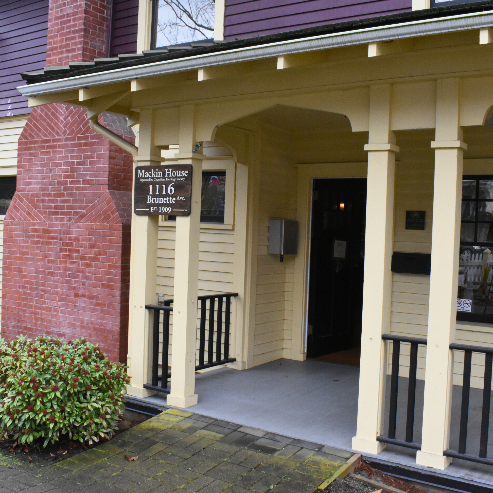 There is an accessible entrance (approx. 36 inches wide) without entryway stairs located Brunette Avenue. The accessible entrance is usually locked. If you’d like to access Mackin House Museum through that door, please either knock or call us at (604) 516-6151 during business hours.