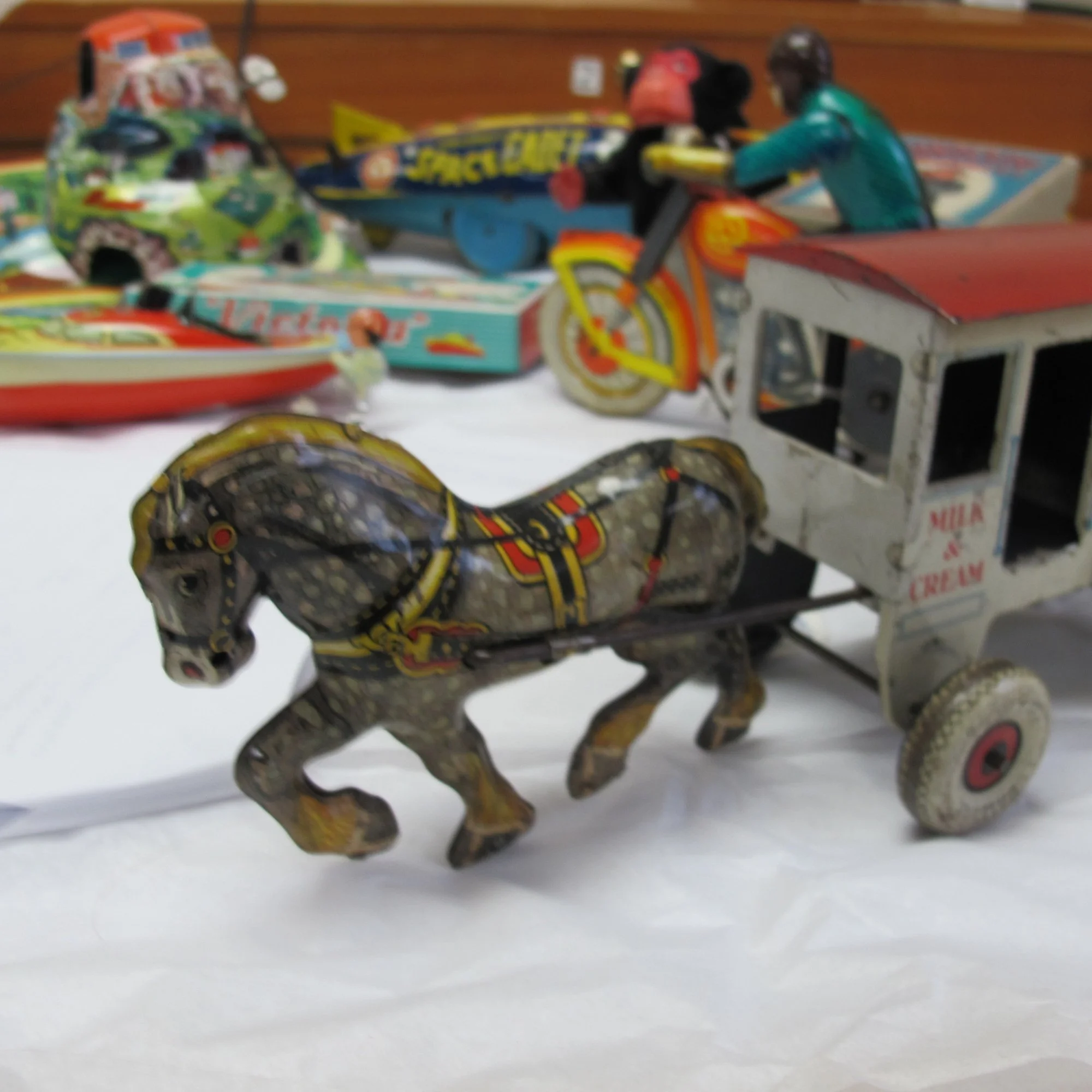 These toys represent scientific discoveries, historical events, romantic fascinations, and cultural whims present in the world throughout the 19th and 20th centuries. From the handmade to plastic, these toys stimulate our imaginations, engage our skills, mimic adult roles, engage creativity, and provide children with opportunities to experiment with and discover the world around them. They are our history; these toys encompass the amusing, the humorous, the entertaining, the delightful, sometimes offensive, but always educational.