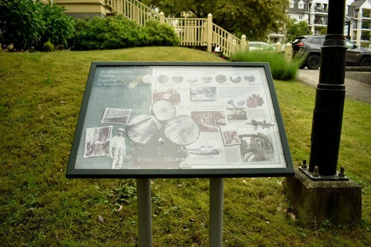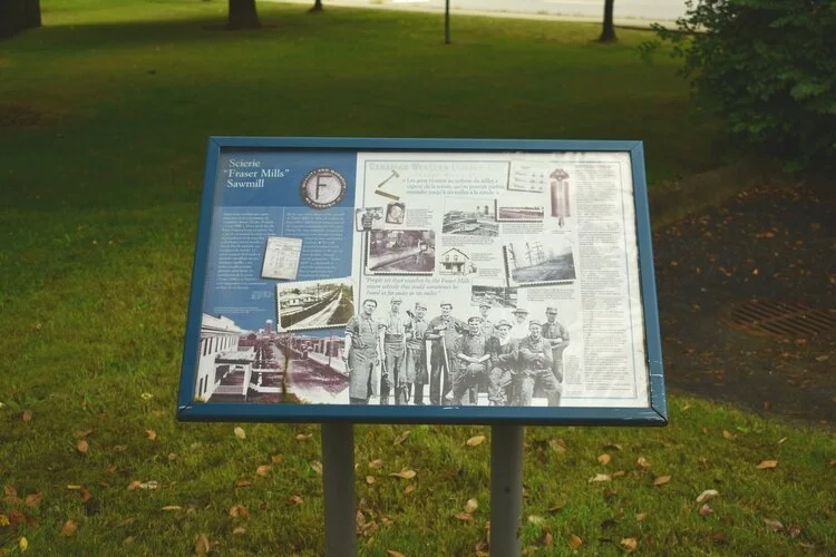Start at the bottom edge of Heritage Square near the train station. To the left of the Fraser Mills sign, you will find the first sign, called “The Interpretive Sign Project.”