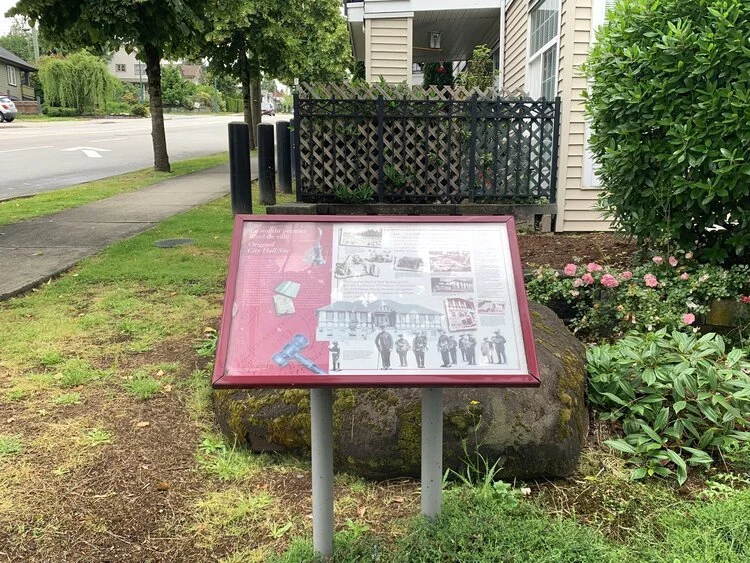 From this point, you are going to leave Heritage Square. Walk towards the corner of King Edward and Brunette and, using the lights, cross Brunette Ave. At the end of the crosswalk is a little concrete area with a bench. In this alcove you will find the seventh sign, called “Old City Hall.”