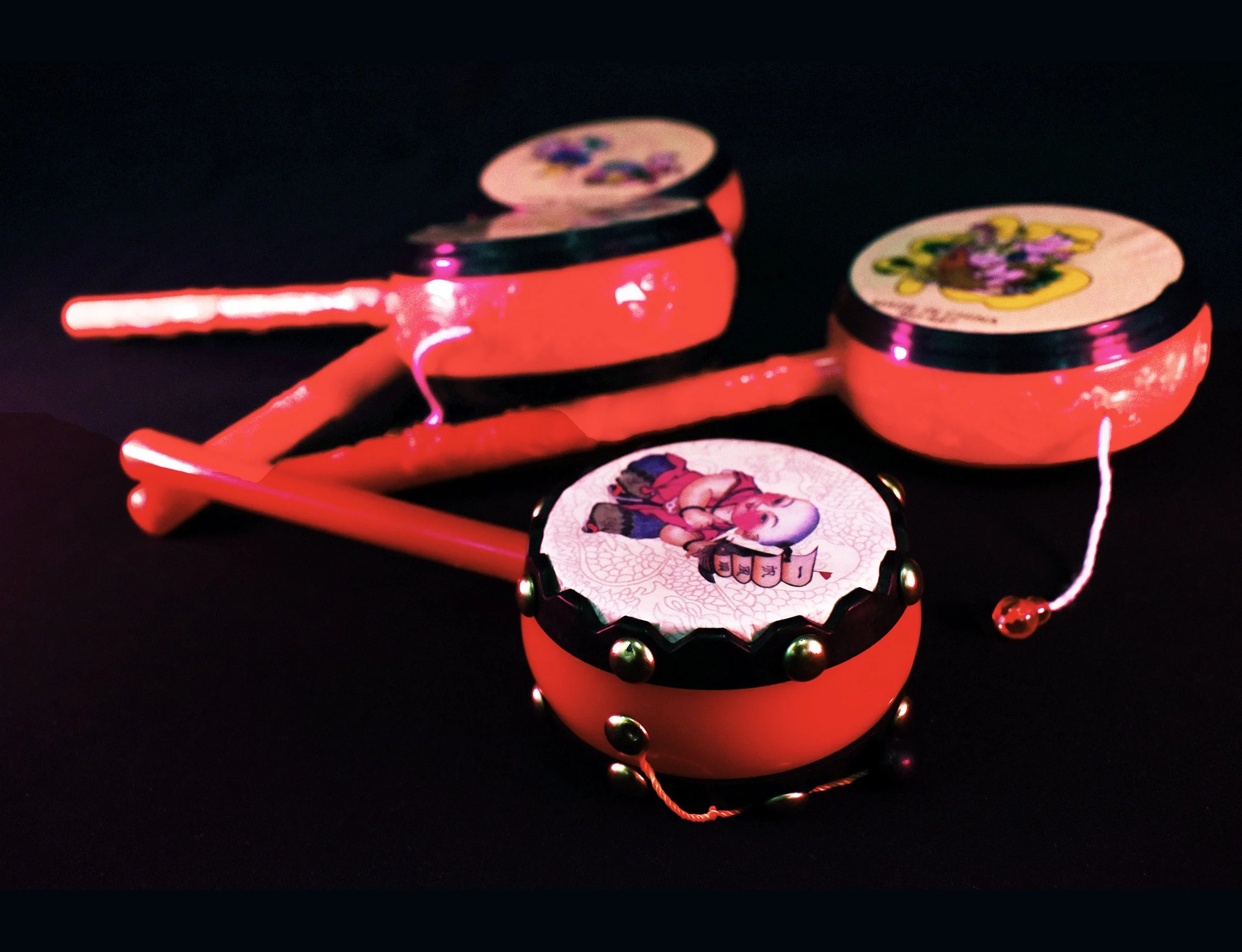 These are traditional Chinese instruments, they are commonly used in festivals, folk harvest events, traditional performances, and Lunar New Year celebrations. The traditional Chinese rattle drum, when spun, the beads swing and hit the drum, making a rattle-like noise.