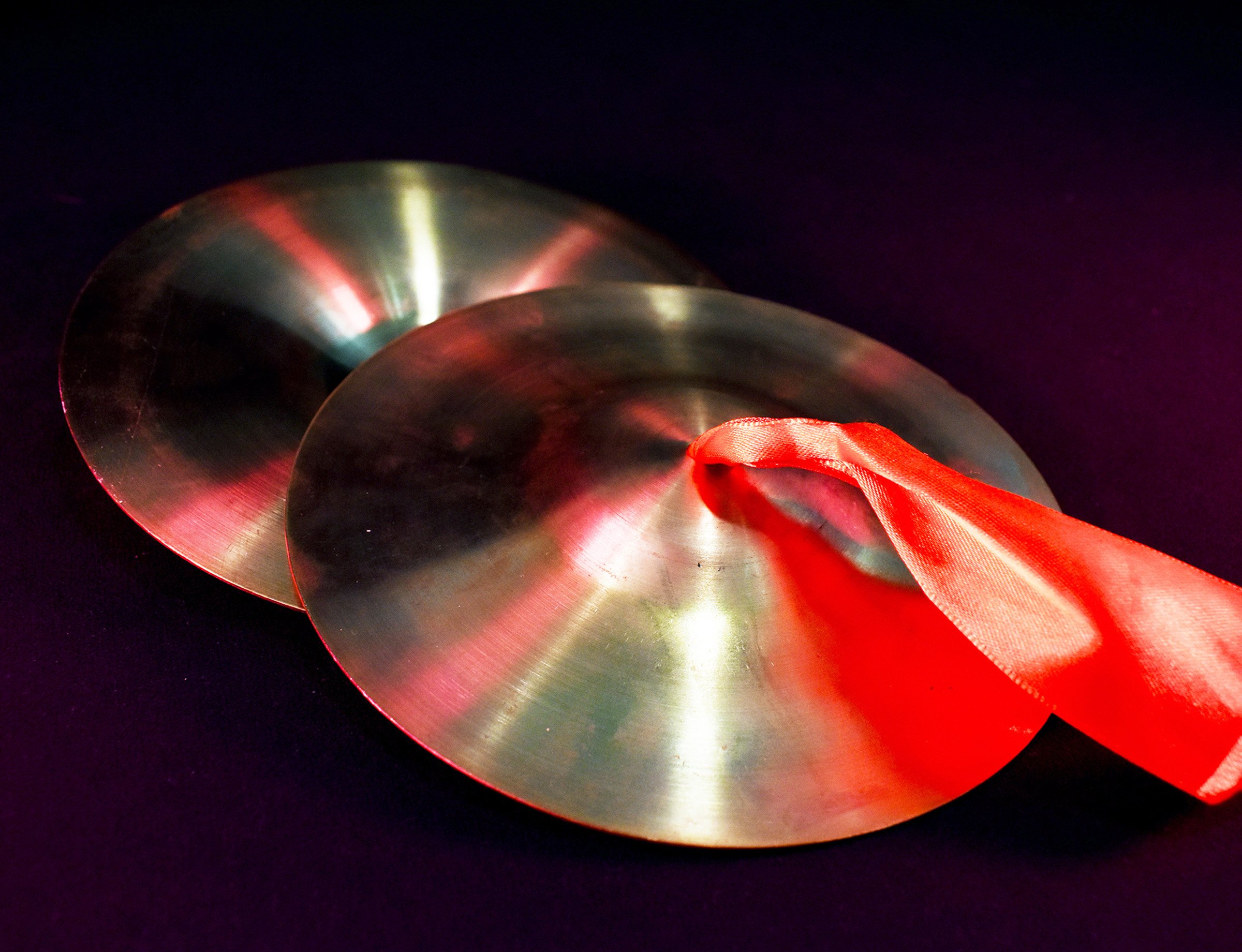 The cymbal’s pitch and sound run relative to its size, this pair of cymbals is small and easily held in each hand via the red ribbon.