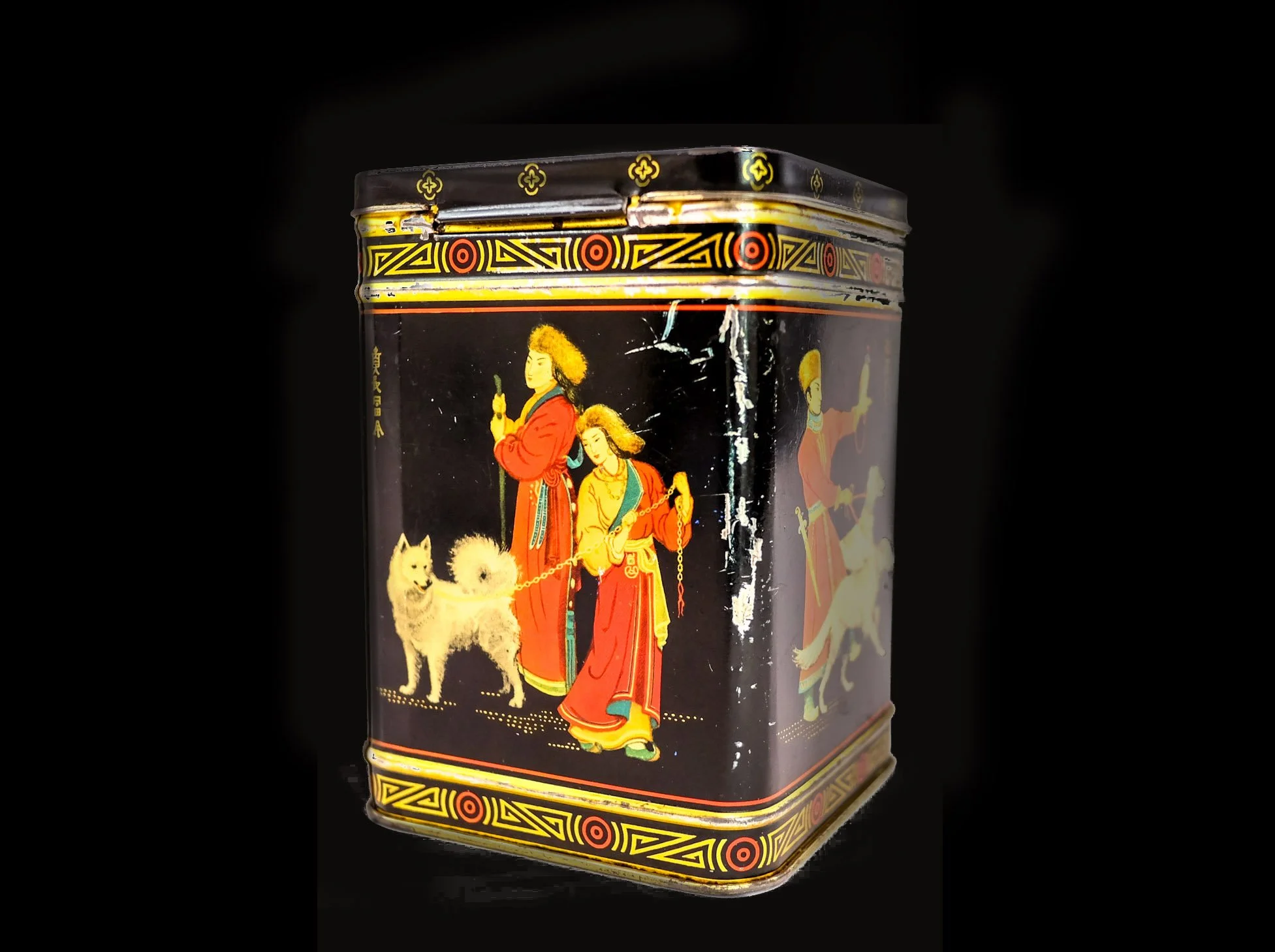 Macfarlane Lang & Co. originally began as a bread bakery in 1817. In 1885, they began to manufacture biscuits. The top of the tin’s lid shows a woman with two Pekingese dogs. The Pekingese is a type of toy dog, originating in China, and its namesake refers to the capital city of Beijing (often Romanized as Peking). Pekingese dogs often served as companion dogs.
