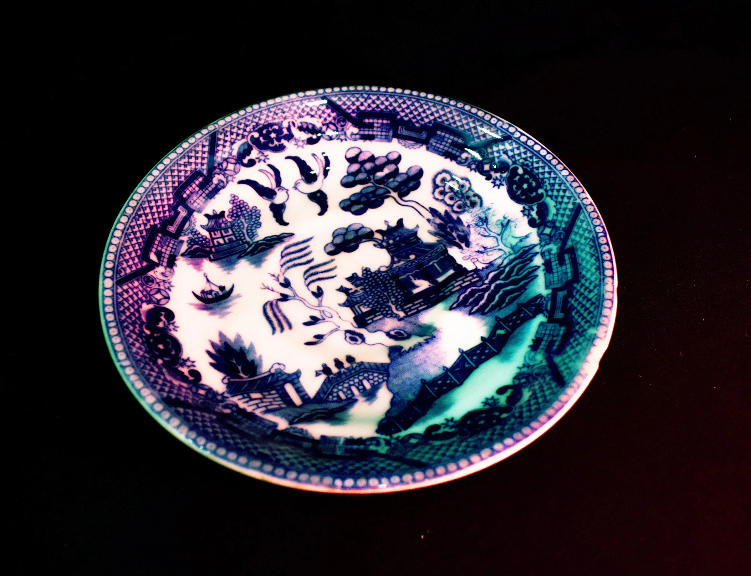This serving platter would have been part of a larger table ware set. The pattern was inspired by a traditional folktale about a pair of lovers. Produced in post-war Japan for export markets, this style of porcelain was designed by Western designers for Western tastes. Ironically Chinese people faced racism in Canada while tableware imitated Asian styles.
