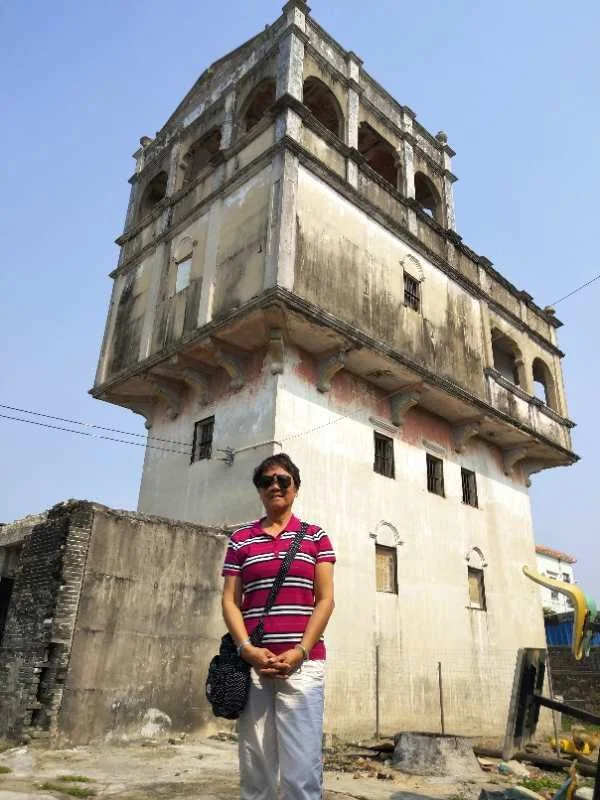 Albert’s sister in front of the fort house, building built with imported materials, bought with the money that great-grandfather brought back to China.