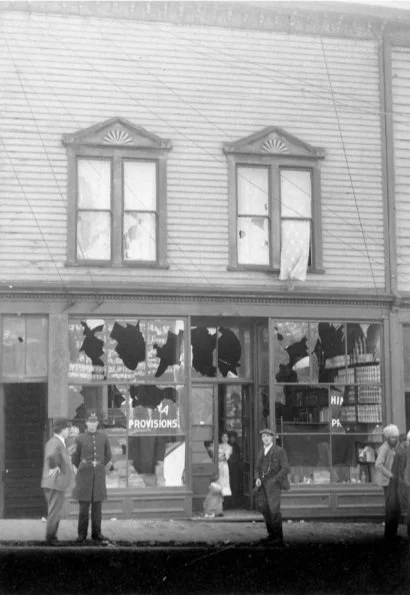 Image: Damage to property of Japanese residents (Nishimura Masuya, Grocer, at 130 Powell Rd., S. Vancouver, 1907.) Library and Archives of Canada, item #3363536.