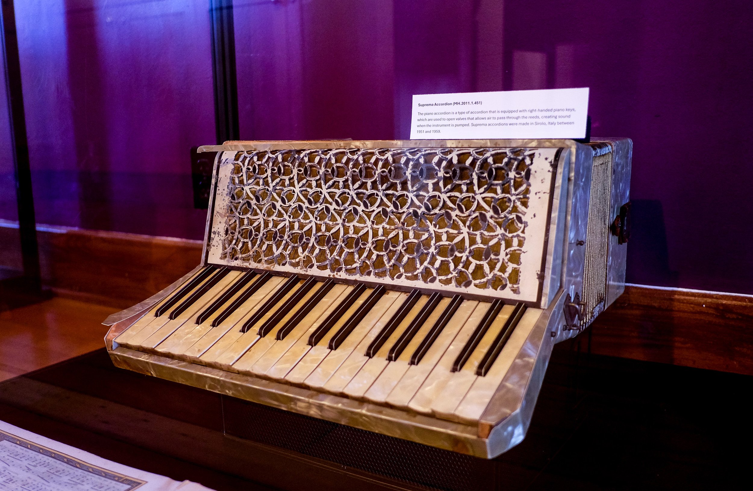 The piano accordion is a type of accordion that is equipped with right-handed piano keys, which are used to open valves that allows air to pass through the reeds, creating sound when the instrument is pumped. Suprema accordions were made in Sirolo, Italy between 1951 and 1959.