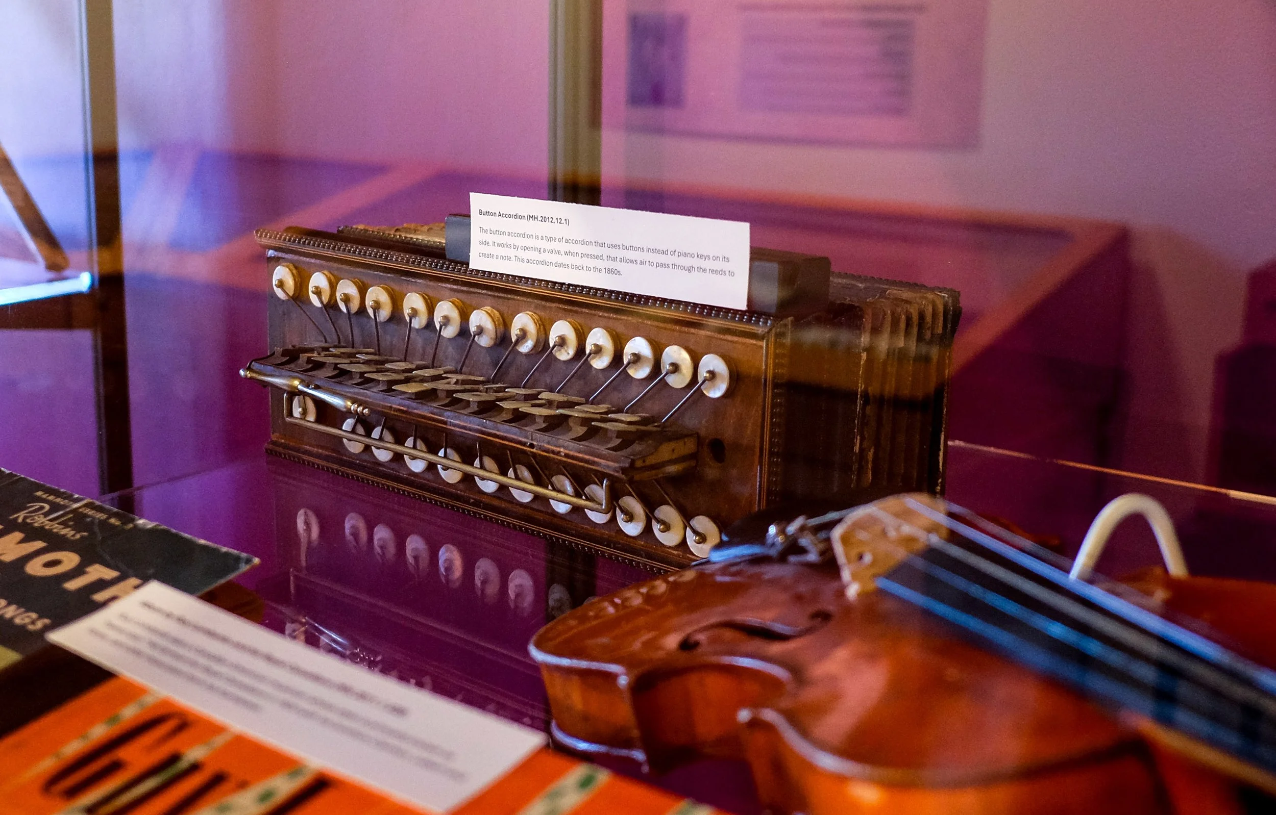 The button accordion is a type of accordion that uses buttons instead of piano keys on its side. It works by opening a valve, when pressed, that allows air to pass through the reeds to create a note. This accordion dates back to the 1860s.