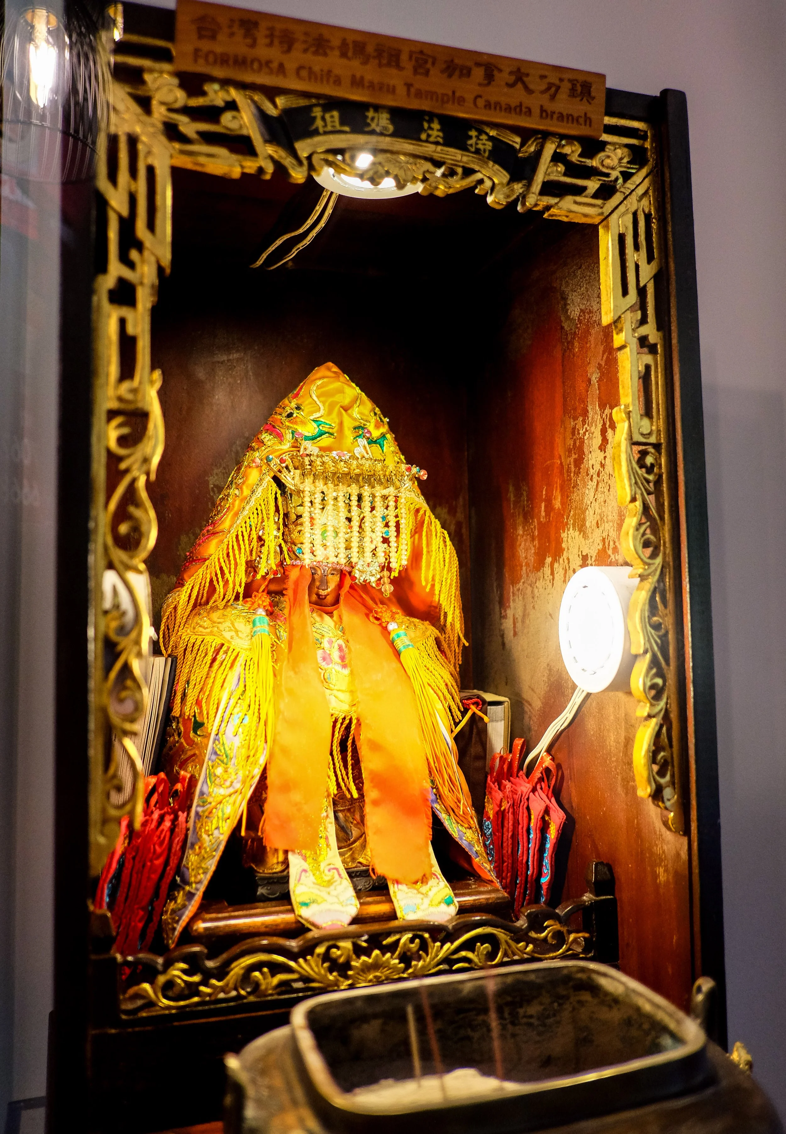 Due to the good grace of the Formosa Chifa Mazu Temple (Canada Branch), a permanent guest boarded Hai Long to keep every passenger safe and loved… a young woman named Ma Zu, dressed in her sacred vestments and upon a gilded throne. Maker’s symbols have dated this Ma Zu shrine to the reign of the Qian Long Emperor (1711 – 1799). According to tradition, Lin Mo — better known as Ma Zu — was born on Meizhou Island, not far from Quanzhou in Fujian province, in the second half of the 10th century. She possessed divine powers, which she used to grant villagers’ prayers for rain and rescue those in trouble at sea. It was one such rescue attempt that took her life, leading locals to erect a temple in her honor.