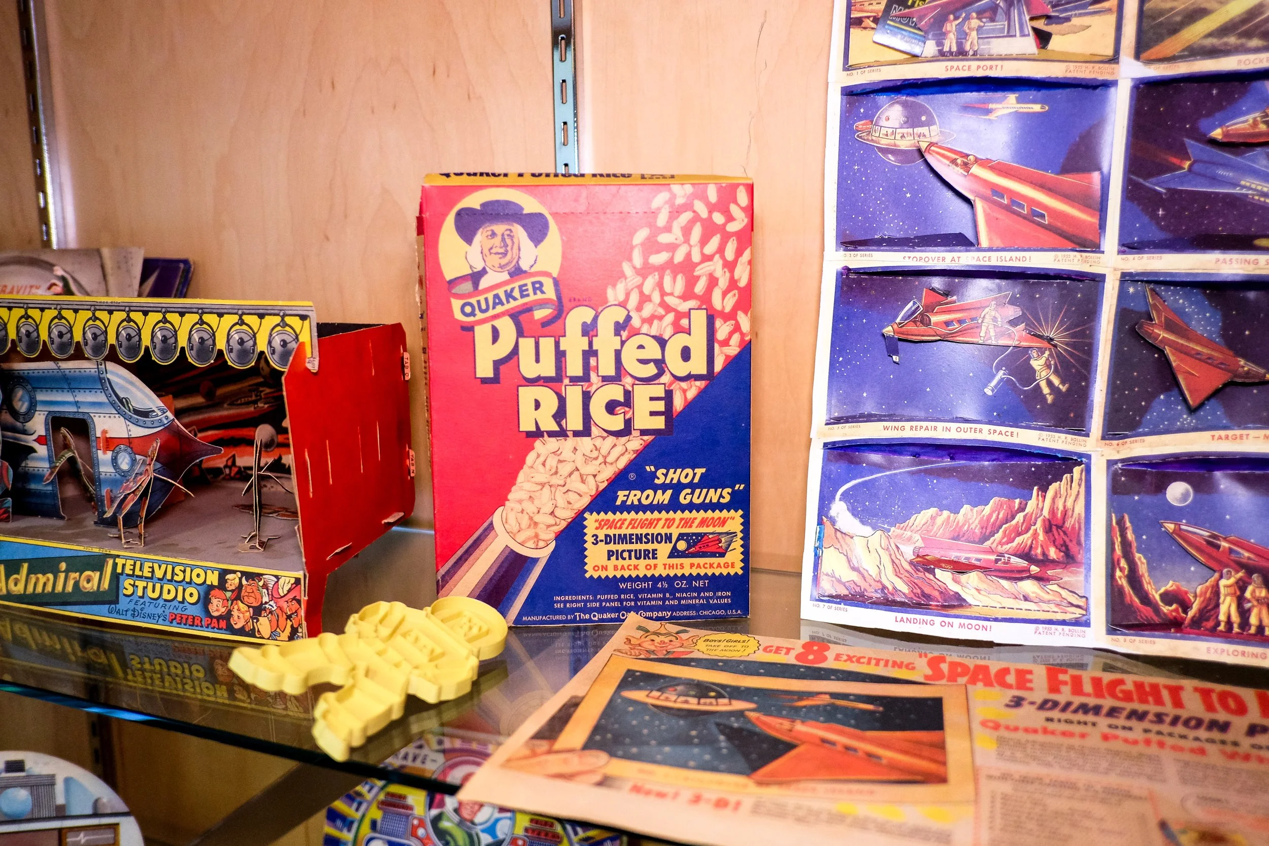 Geoff was initially drawn to collecting trading cards, from there he expanded his collection. Companies like Tip-Top Bread or Skelly would include trading cards in their products, Quaker Oats and even egg cartons would either include toys or have part of their package dedicated to be cut out. Quite a few items in his collection are objects like the egg cartons on display, or the kid in an Astronaut suit on a cardboard promoting chocolate. Marketing items of which not many were produced, and have since been largely lost.