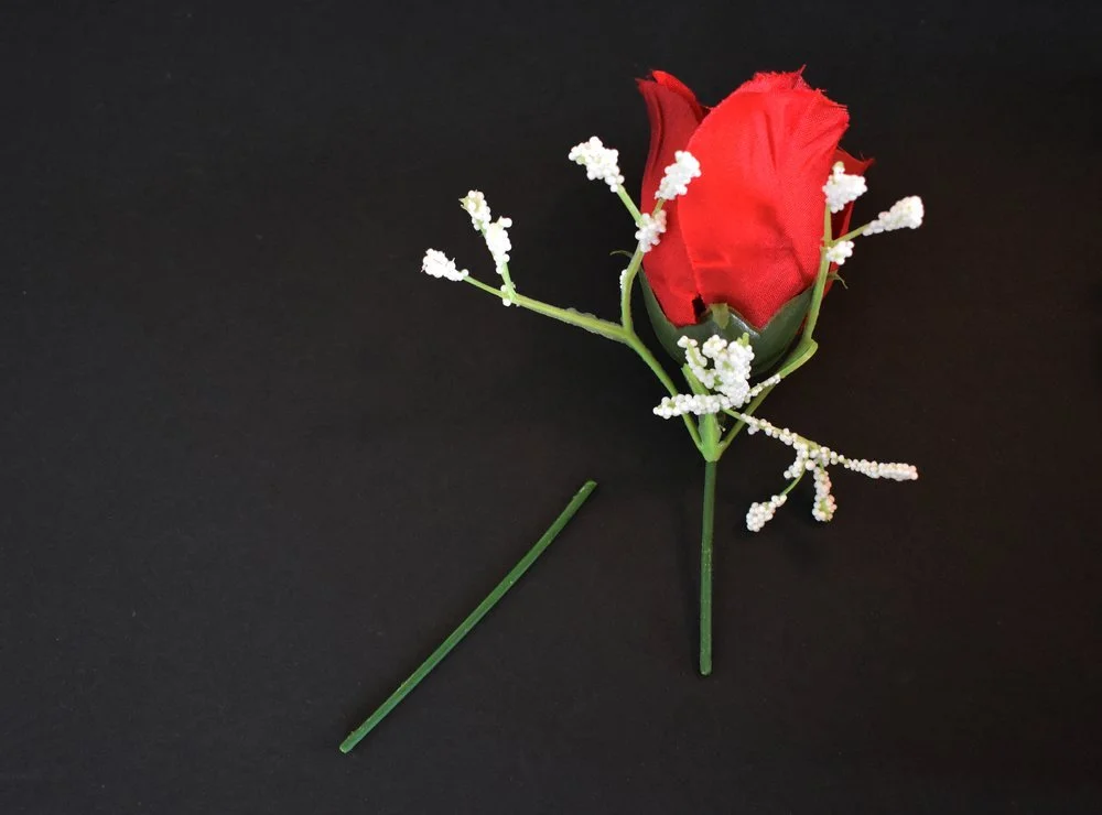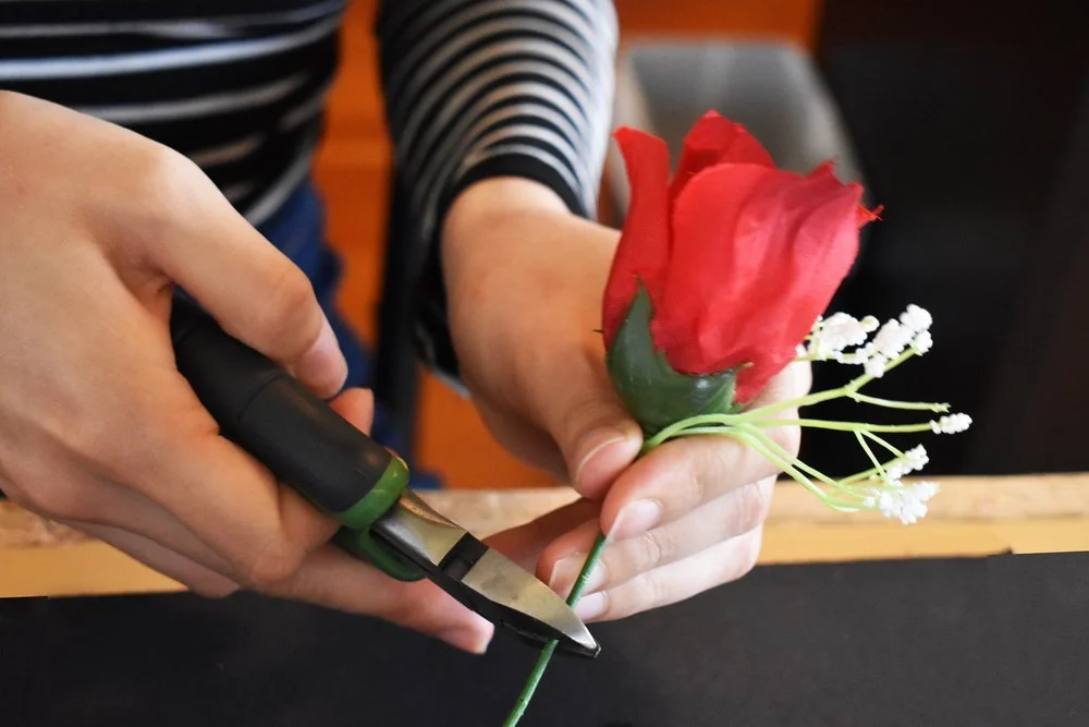 Trim the rose stems using a wire cutter, leaving about two inches of stem on the flower. Be sure to save the trimmed off stem, as we will be using it later in Step 8.