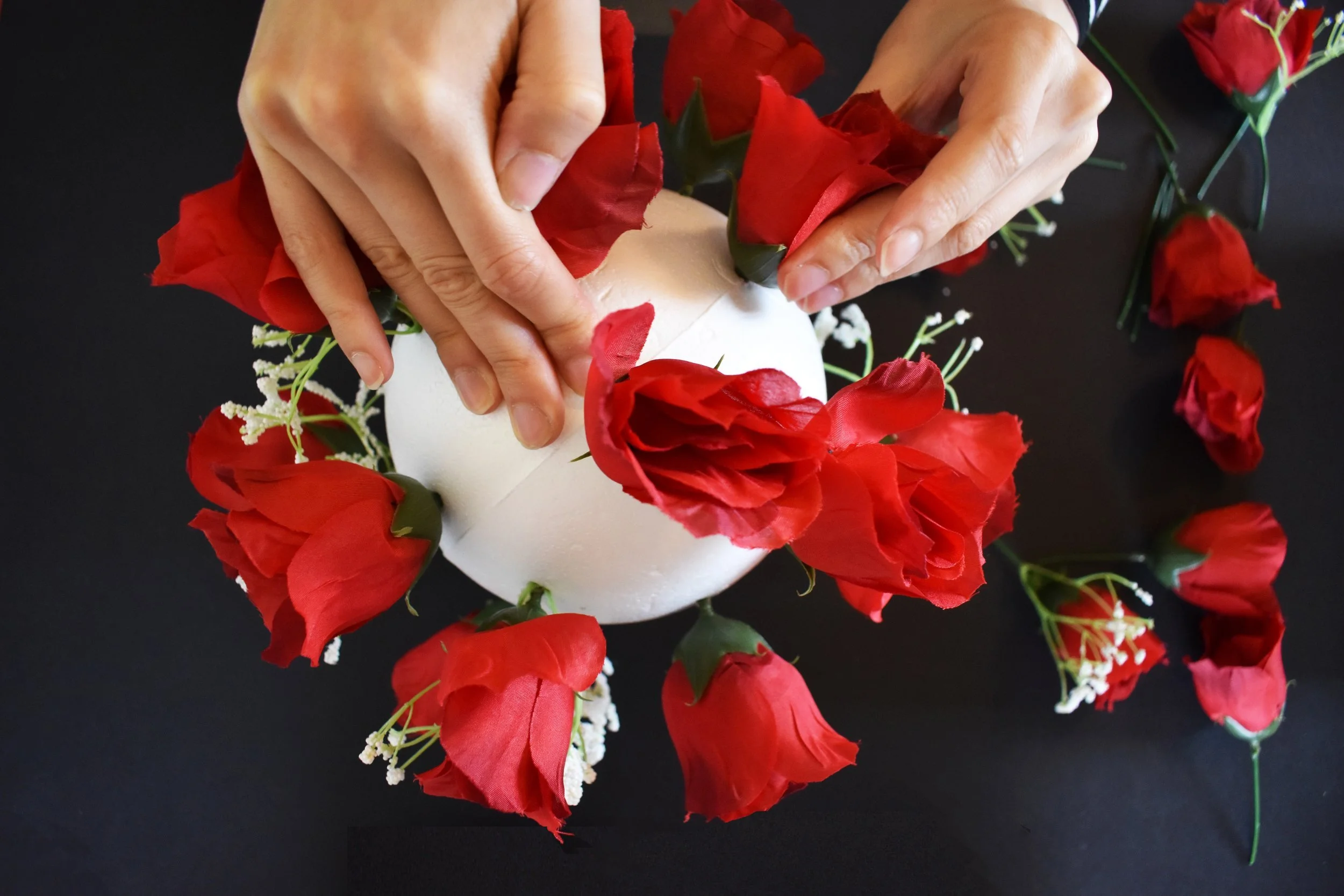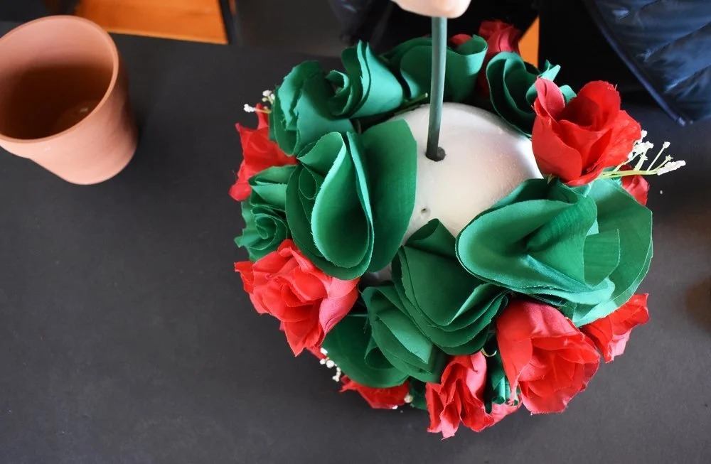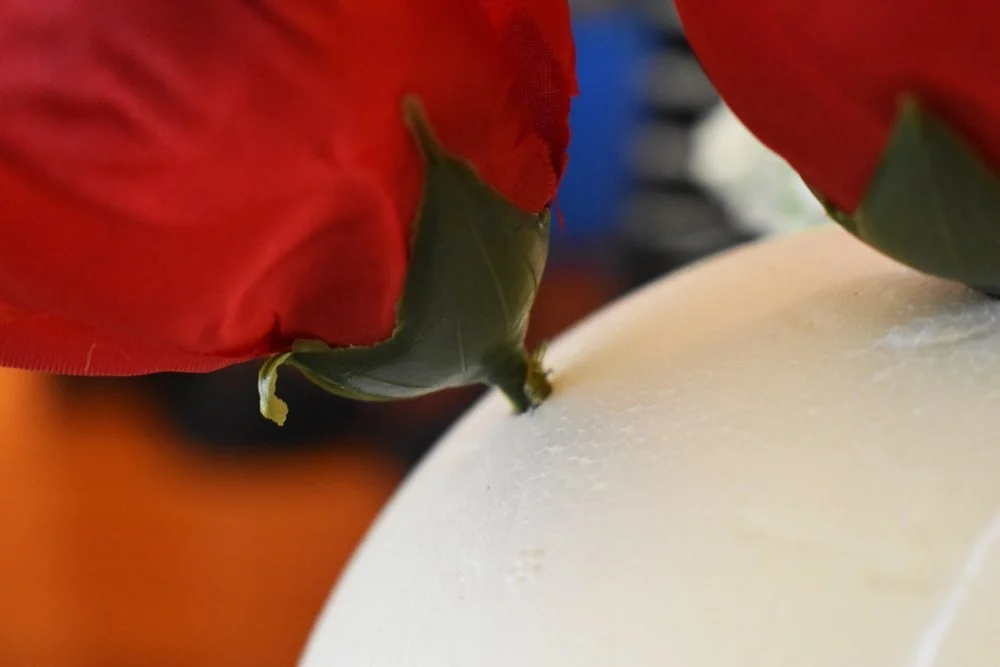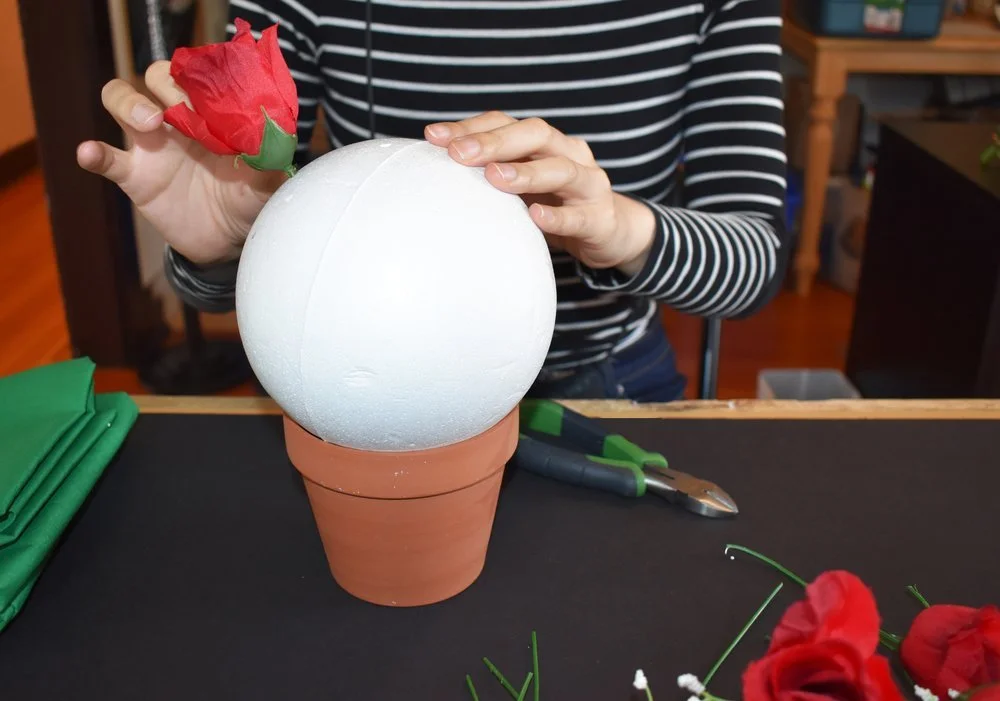 Place the foam ball on the clay flower pot for stability and then push the wire stems of the roses into the foam ball as far as they will go ( so the flower bottom touches the ball). Be sure to space the roses about 2” apart.
