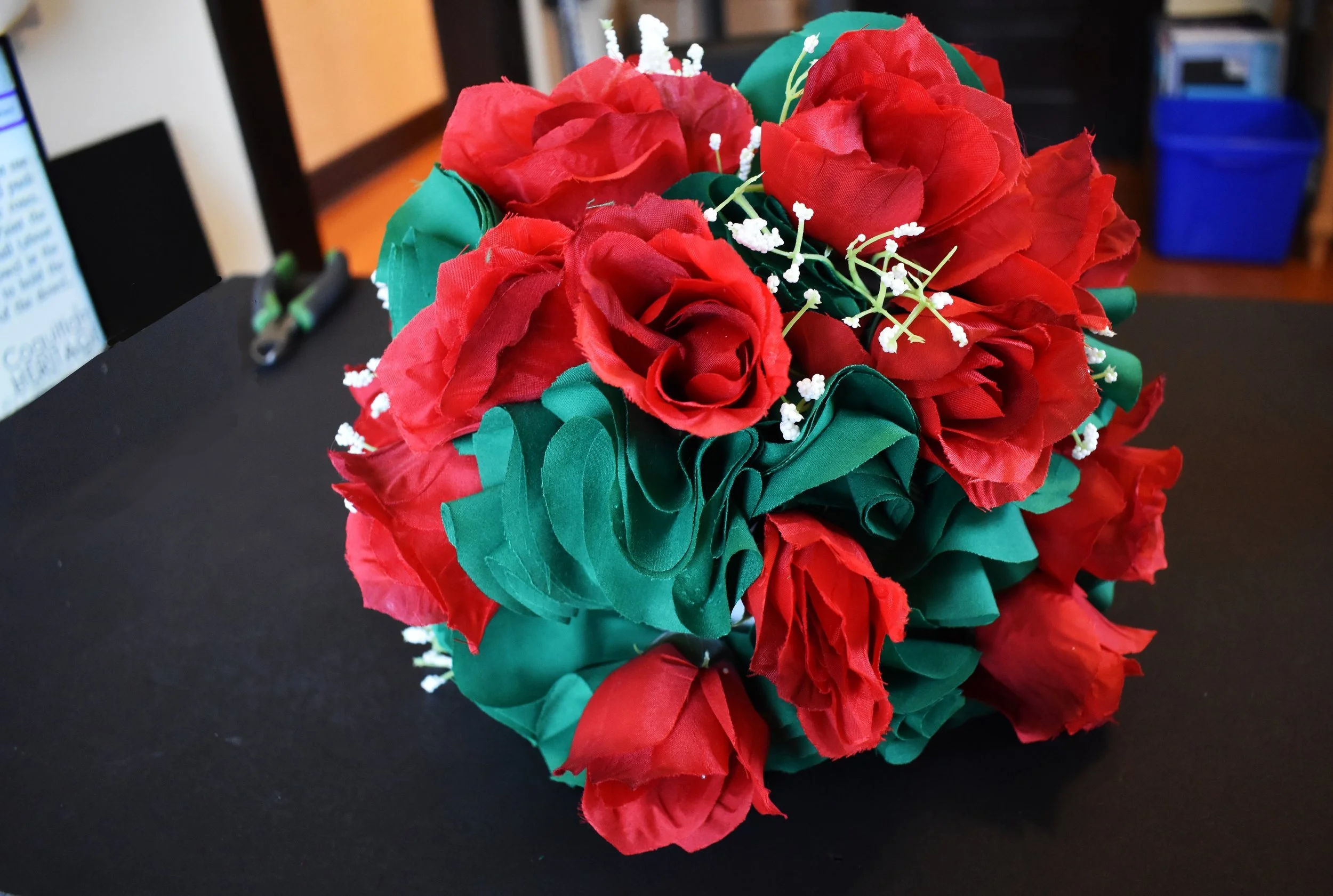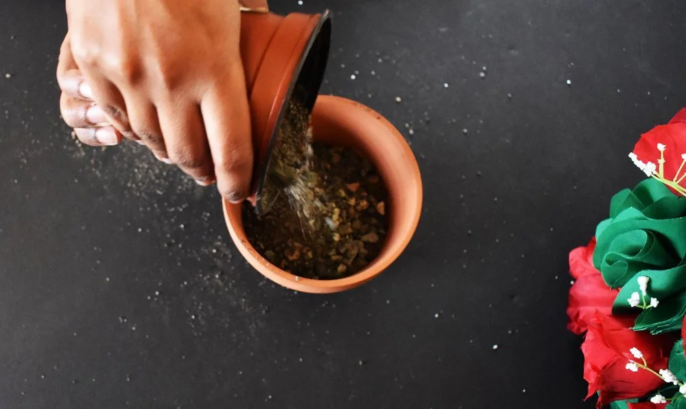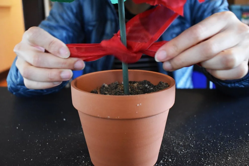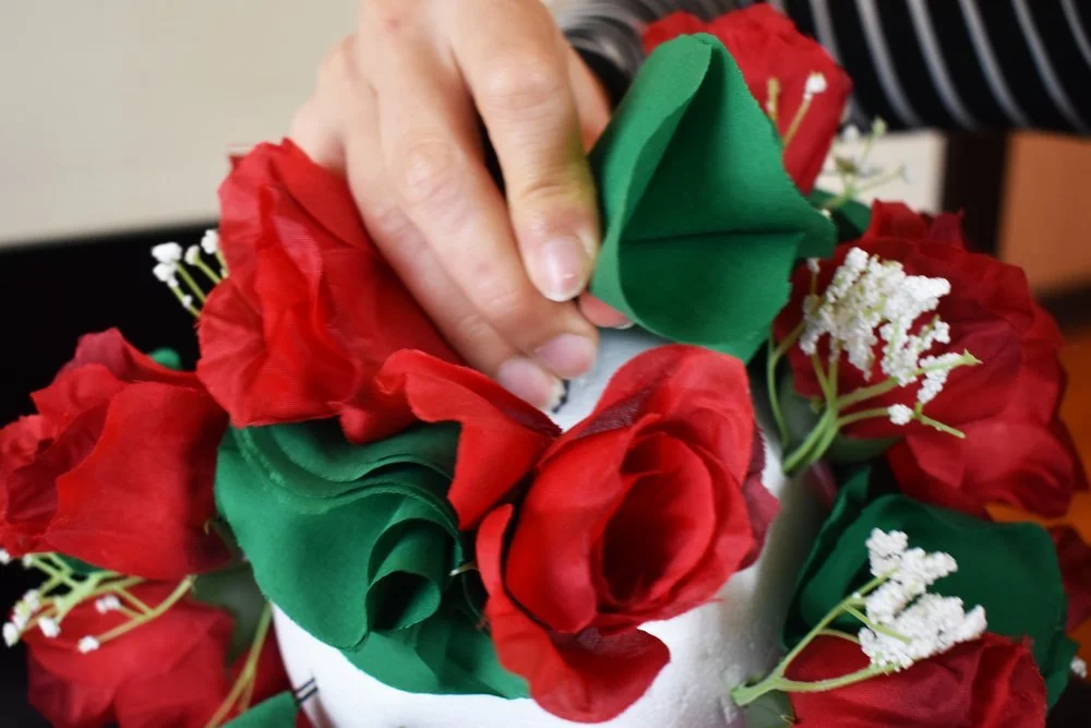 Place the foam ball on the clay flower pot for stability and then push the wire stems of the roses into the foam ball as far as they will go ( so the flower bottom touches the ball). Be sure to space the roses about 2” apart.