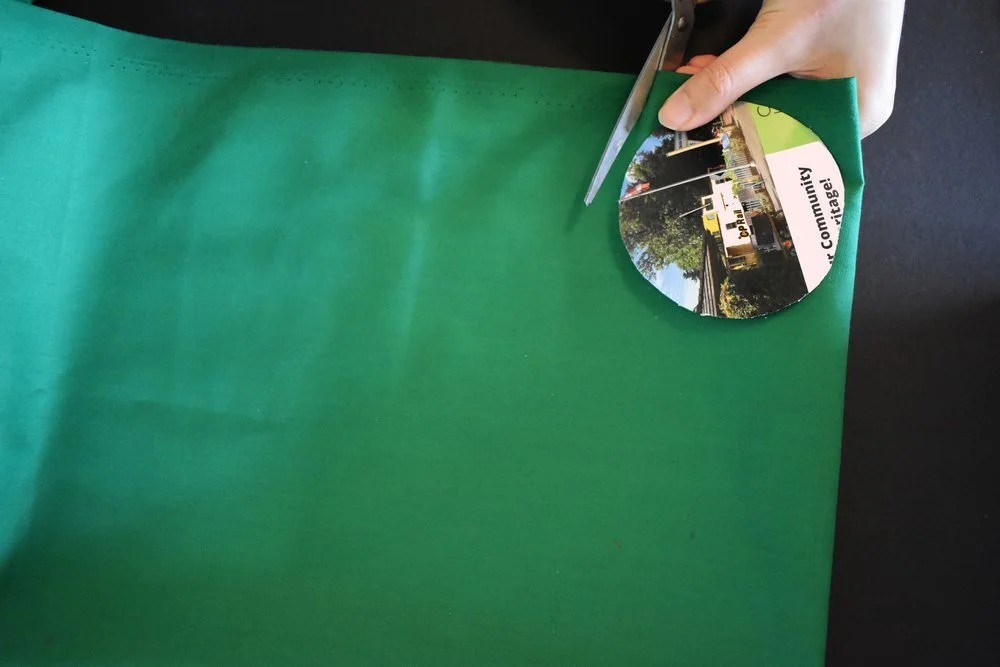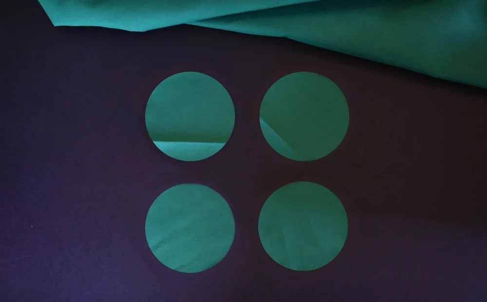 Using the 4” disc templates (we recommend making them out of cardstock), cut out 120 fabric discs. Cut them out as evenly as possible, although discs with rough edges do add to the flower pompons’ overall aesthetic. Divide them into groups of 4, we will be making 30 flower pompons (each one being made up of four discs).