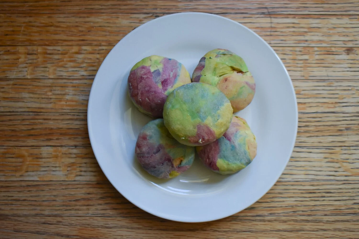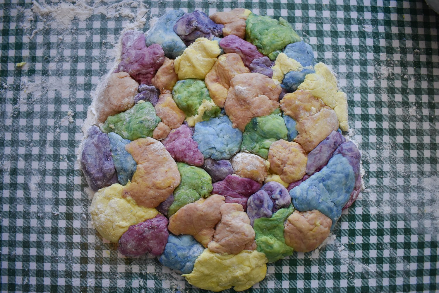 Divide dough into six equal portions. Knead a few drops of food colouring into each portion. Wear gloves to avoid staining hands.