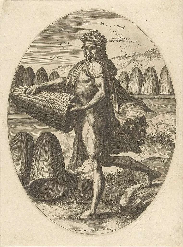 Engraving of Aristaeus, The Greek God of Bees, by Dutch engraver Cornelis Cort (1565) via Picryl https://picryl.com/media/aristaeus-3ebd8c