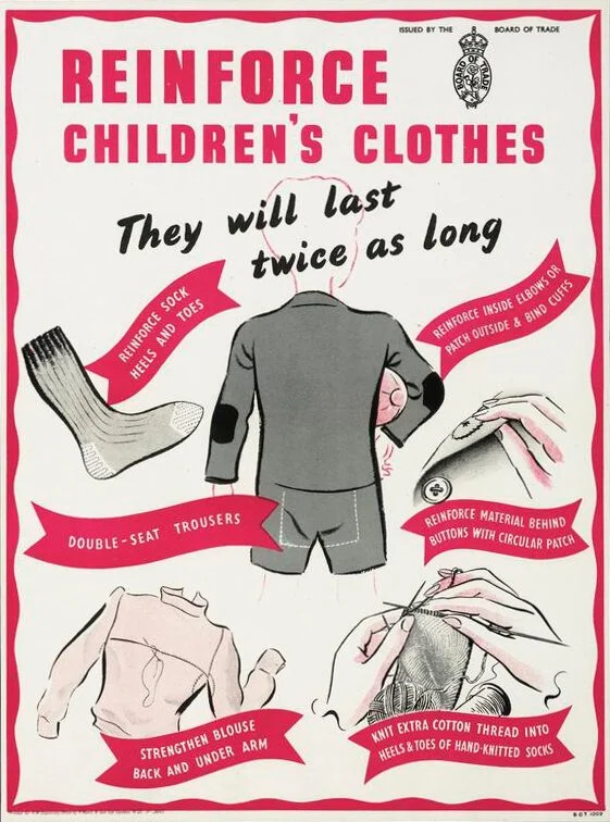 Make Do and Mend came about as more and more materials were rationed during the war. Rubber, cloth, gas, and metal were deemed essential for the war effort and propaganda deemed it unpatriotic to be wasteful. Women would fashion clothes for themselves and their children from their husband’s suits. Boys and girls alike learned how to knit. People carpooled to work to save gas needed for the war effort. In order to have the food, fuel, and household items to get through daily life during a war, people had to become very creative with what they already owned.